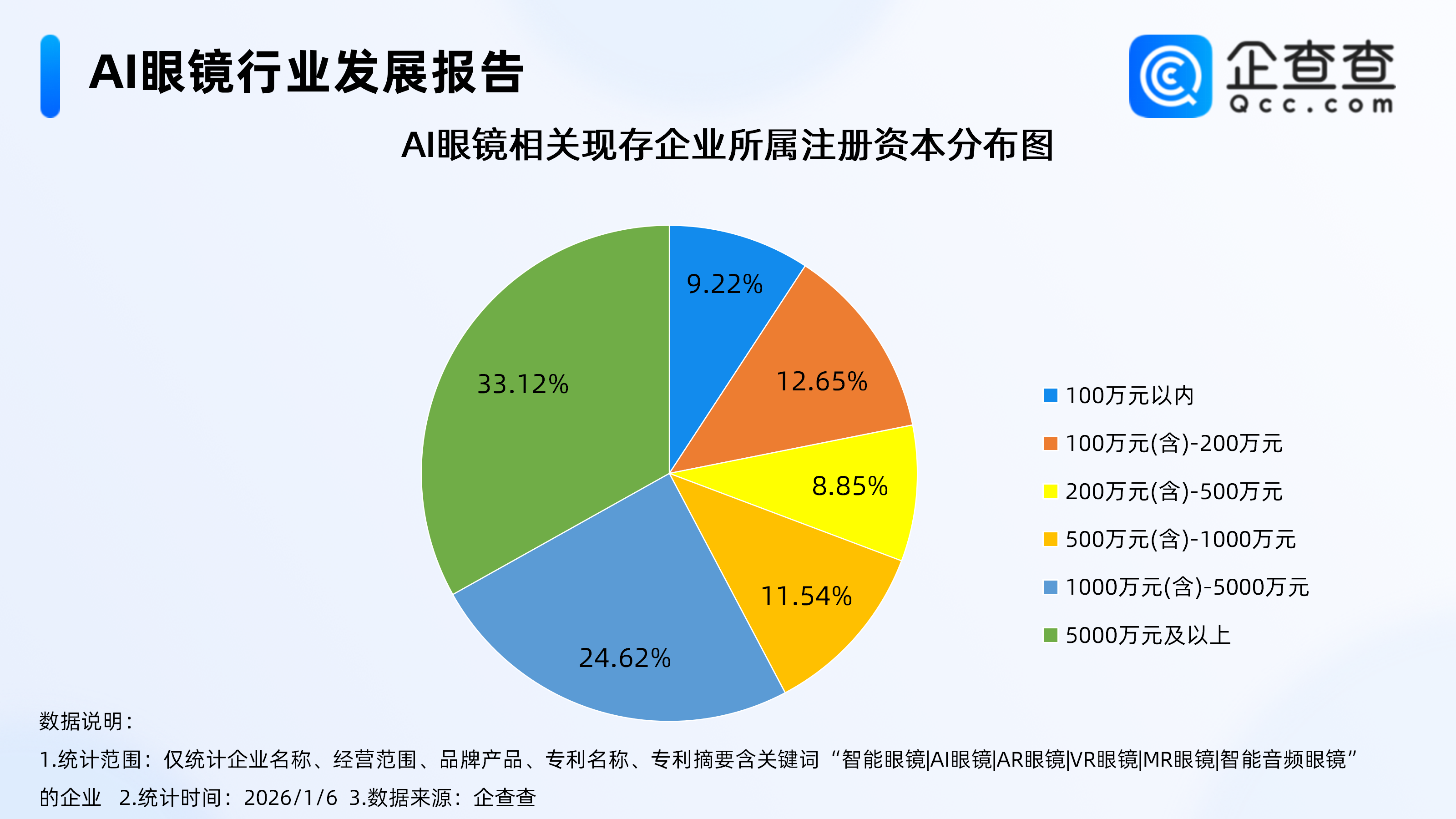 企查查数据显示,截至1月6日,国内现存AI眼镜相关企业5843家,超3成相关企业位于广东省,占比达31.34%。广东AI眼镜相关企业,多集中在深圳市,位于深圳的相关企业,占广东存量的66%、占全国存量的21%。2、近6成相关企业注册资本在千万元及以上