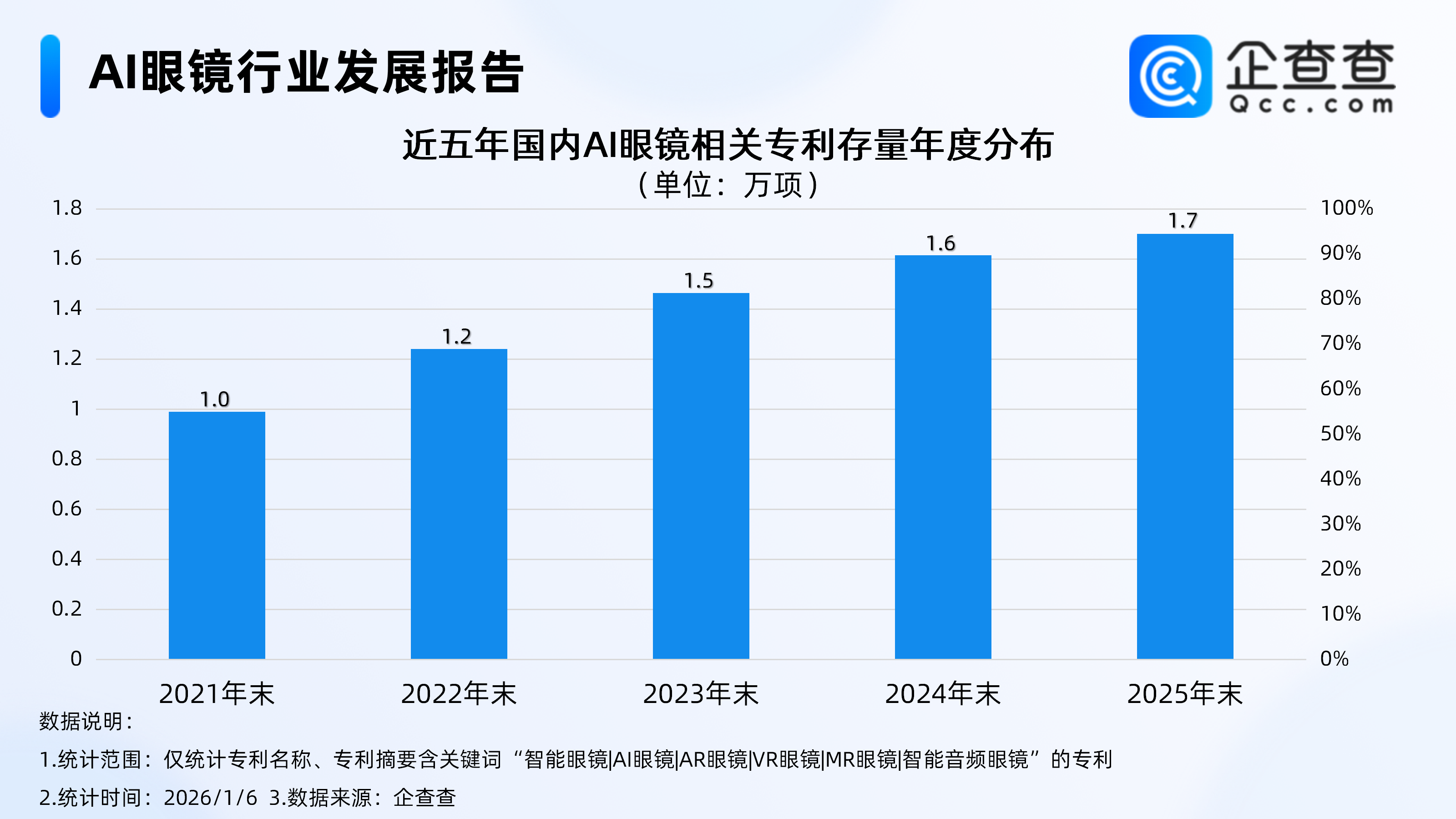 2026开年,AI眼镜大消息不断。据央视新闻,1月5日,AR眼镜龙头企业雷鸟创新(RayNeo)宣布完成新一轮10亿元融资。本轮融资由中国移动链长基金与中信金石(旗下含茅台金石基金)领投,中国联通旗下联创创新基金等机构共同参与。据雷鸟创新披露,本轮资金将重点投向核心技术研发与全球市场拓展,尤其是在轻量化光学方案、独立通信能力等关键领域的突破。东吴证券指出,2026年将成为AI终端创新元年,Meta、苹果、谷歌、OpenAI等科技巨头均有新终端产品推出,以AI眼镜为代表的新形态终端将加速落地。伴随模型迭代和应用场景开发提速,下一代爆款终端有望在大厂创新周期中诞生。根据IDC最新报告,2025年第三季度全球智能眼镜出货量达429.6万台,同比增长74.1%。IDC预测,2025年全球智能眼镜市场出货量为1280万台,同比增长26%。其中,中国智能眼镜市场出货量将达到275万台,同比增长107%。企查查数据显示,截至1月6日,国内现存AI眼镜相关企业5843家,超3成相关企业位于广东省。注册资本方面,近6成相关企业注册资本在千万元及以上。专利方面,近五年AI眼镜相关专利量逐年稳步增长,截至目前,国内现存AI眼镜相关专利达1.7万项,其中实用新型专利最多,占比36%。1、超3成相关企业位于广东省